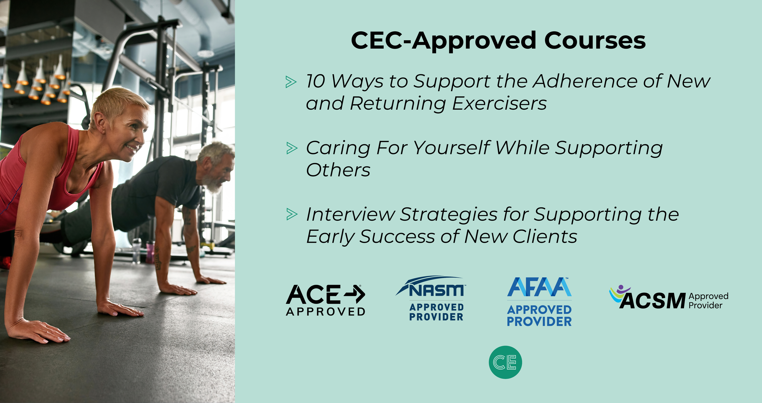 ACE, NASM, and ACSM CEC-approved courses for fitness and wellness professionals.